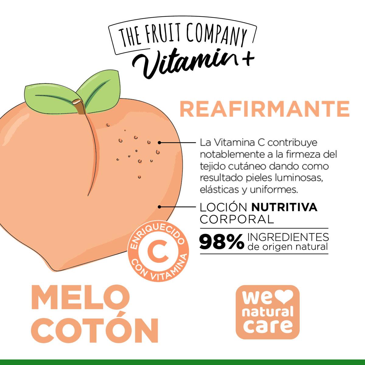 ¡Lleva tu rutina de cuidado de la piel a un nuevo nivel con la Loción Corporal Melocotón Vitamin+ The Fruit Company! Su rica y ligera fórmula REAFIRMANTE ayuda a mantener la elasticidad, igualar el tono de la piel y llenarla de luminosidad. Enriquecida con vitamina C y un 98 % de ingredientes de origen natural, esta loción nutritiva reafirmante dejará tu piel con una sensación suave, tersa y firme como nunca antes. Disfruta de su dulce aroma a melocotón peach bellini mientras hidratas y cuidas de tu piel al máximo.